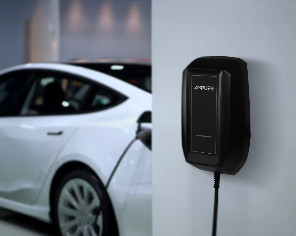 Car charging cable set with a white box labeled 'Ampure' held by a person against a dark background. Car charging cable set with a white box labeled 'Ampure' held by a person against a dark background.